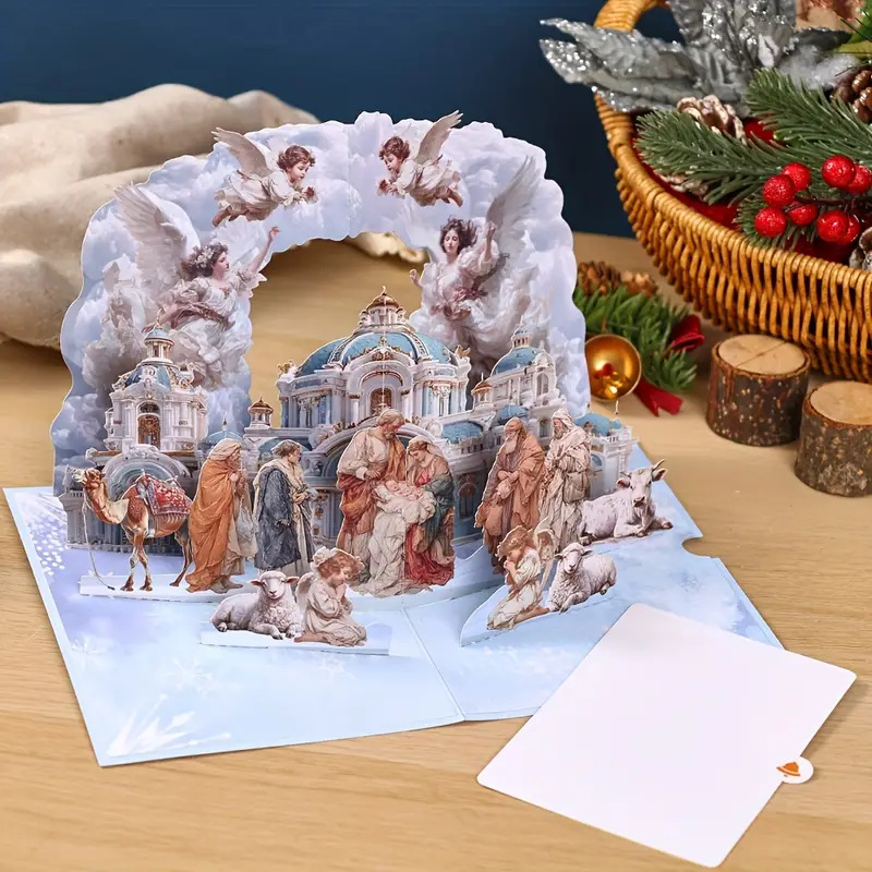 3D Pop-Up Surprise That Wows: Open the card, and a delicate, three-dimensional Nativity scene pops up instantly—complete with tiny handcrafted figures (Mary, Joseph, the baby Jesus in the manger), soft-hued stable details, and subtle greenery. It’s not just a card; it’s a mini “scene” they’ll want to display on their mantel all season long.