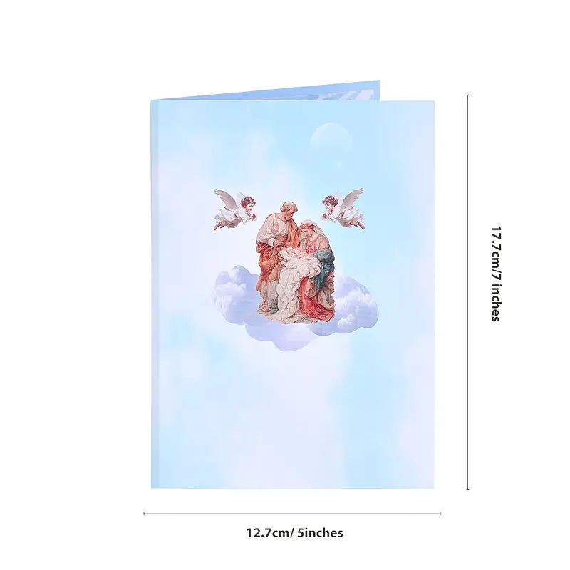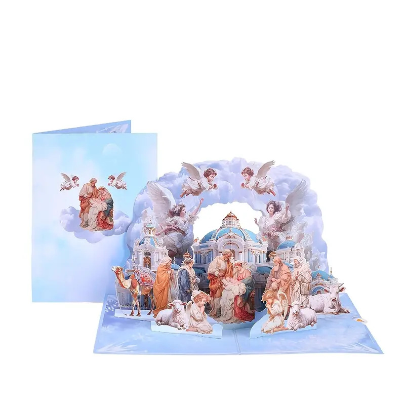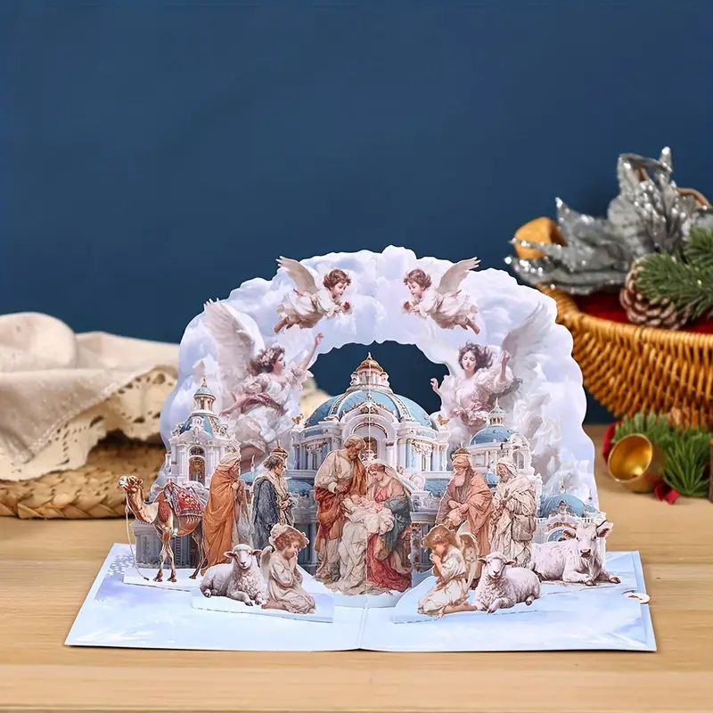 3D Pop-Up Surprise That Wows: Open the card, and a delicate, three-dimensional Nativity scene pops up instantly—complete with tiny handcrafted figures (Mary, Joseph, the baby Jesus in the manger), soft-hued stable details, and subtle greenery. It’s not just a card; it’s a mini “scene” they’ll want to display on their mantel all season long.